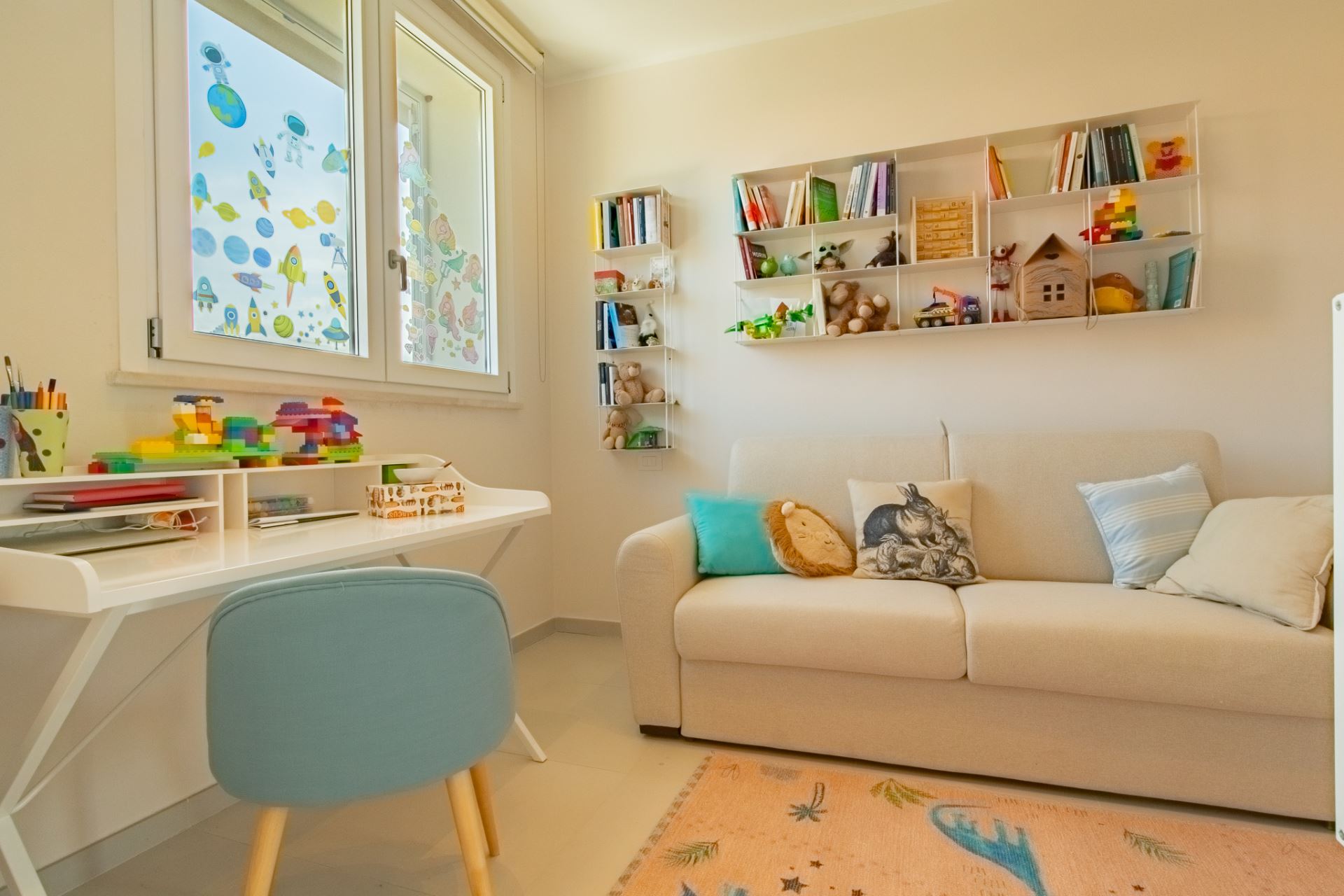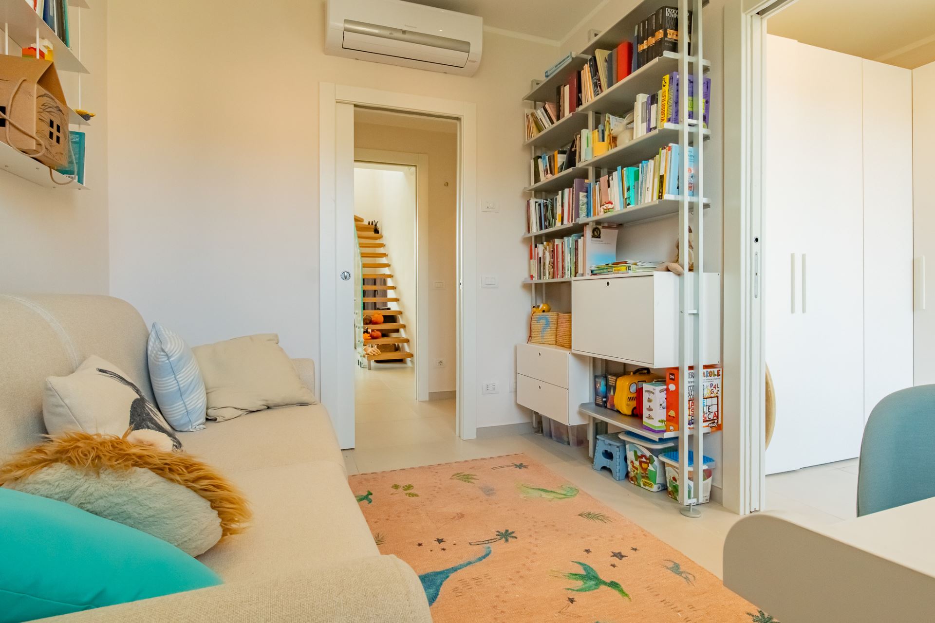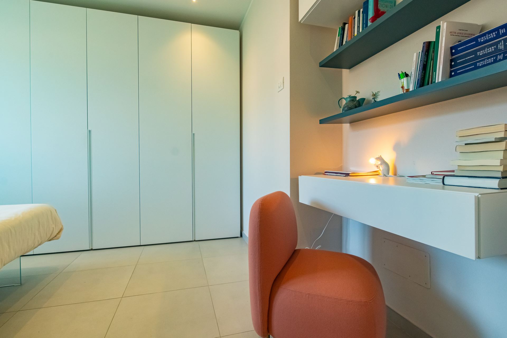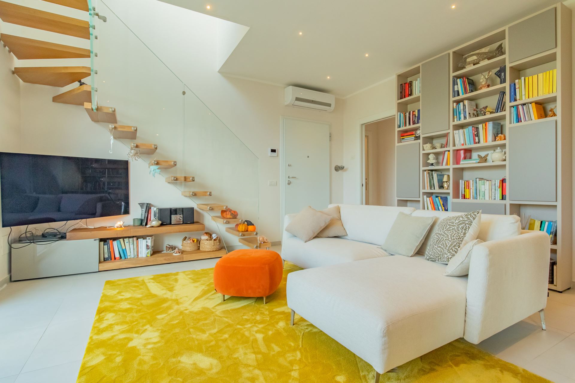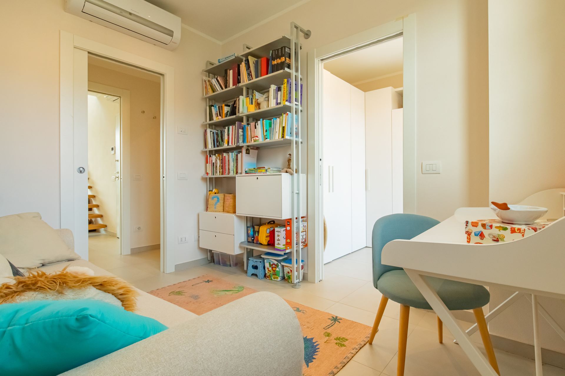 L’alloggio può ospitare comodamente fino a 6 persone ed è composto da due camere da letto, due bagni, una luminosa zona giorno con sala e cucina attrezzata. Il soppalco, dotato di divano letto, offre uno spazio aggiuntivo pratico e confortevole.